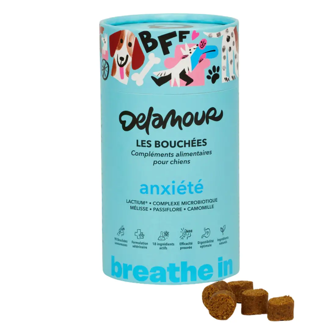 Découvrez Les Bouchées Anxiété de DELAMOUR, un complément alimentaire naturel, savoureux et facile à administrer, conçu pour aider votre chien à retrouver calme et sérénité au quotidien.