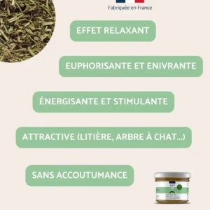 Présentée sous forme séchée et en petits morceaux, la cataire est idéale pour attirer votre chat vers son griffoir, sa litière, son panier, ses jouets ou même sa caisse de transport. Elle est également efficace pour redynamiser les chats plus âgés ou ceux ayant perdu de l’activité.