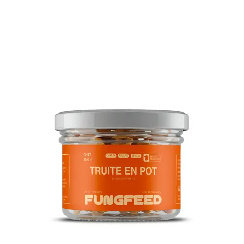 Offrez à votre chat une friandise naturelle, saine et gourmande avec la Truite en pot FUNGFEED. Élaborée à partir de truite 100% française, cette friandise riche en protéines de qualité et en acides gras oméga-3 soutient la santé de la peau, du pelage et du système immunitaire de votre félin.