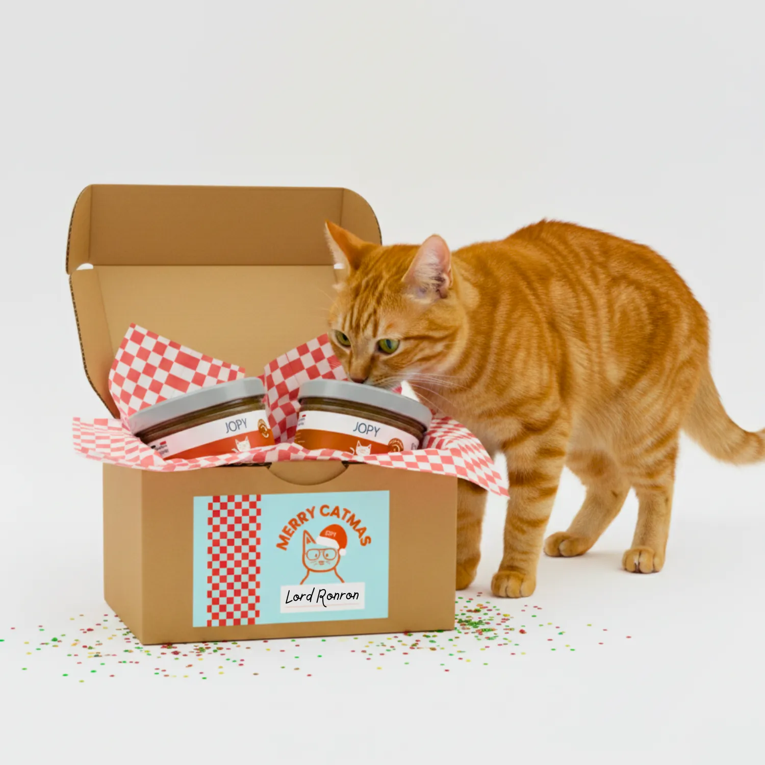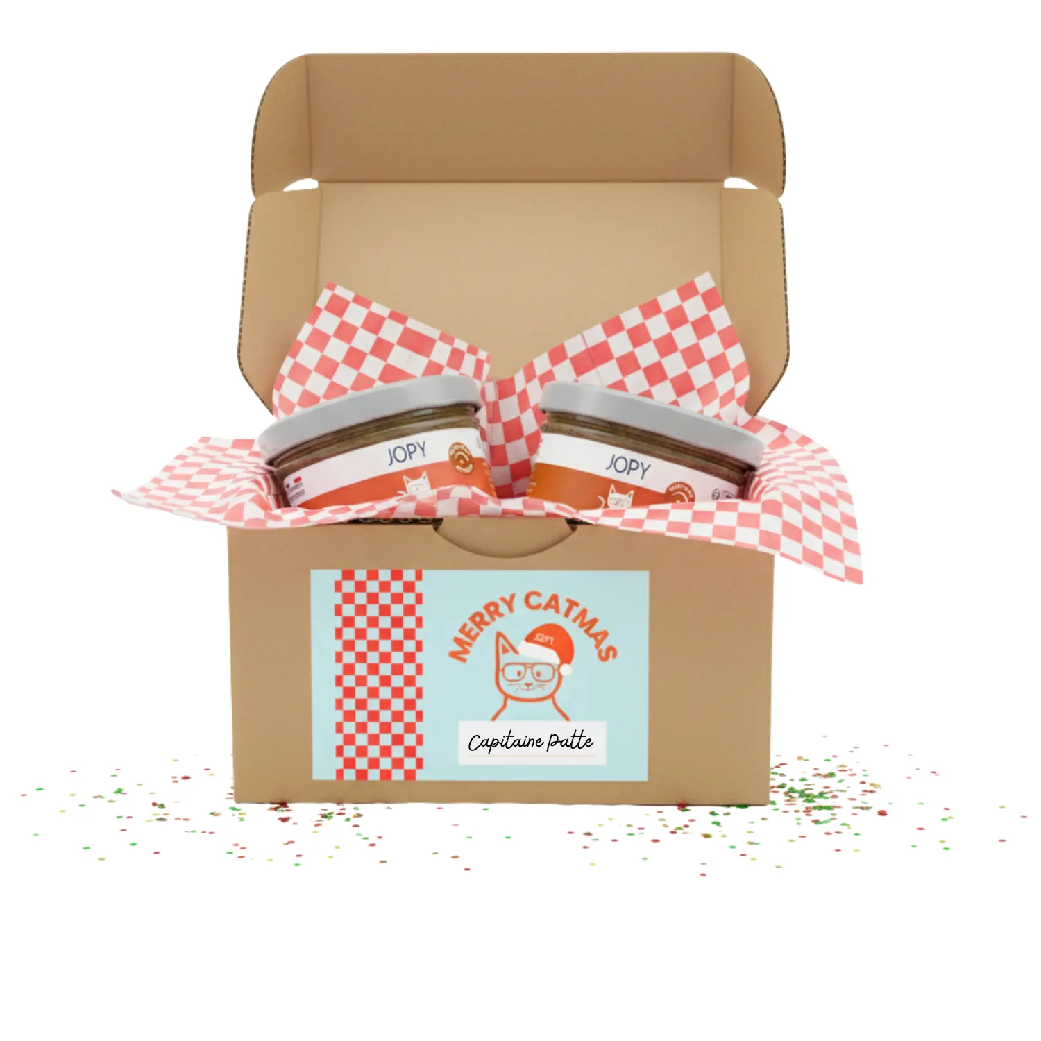 Offrez à votre chat (ou à celui d’un proche !) un Noël gastronomique avec notre coffret premium. Deux bocaux de pâtées aux saveurs délicates, présentés dans un écrin personnalisable : le cadeau idéal pour célébrer les fêtes avec votre félin adoré.