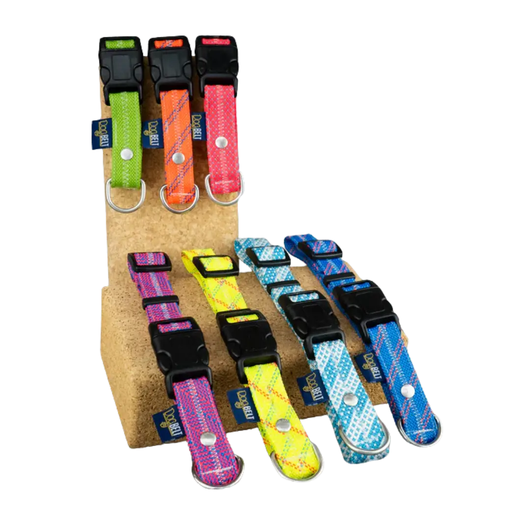Collier pour chien en corde d’escalade recyclée, coloré, robuste et réglable, offrant un style unique à votre chien.