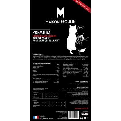 Les croquettes Premium sans céréales pour chats actifs et chatons de la marque Maison Moulin sont produites en France.