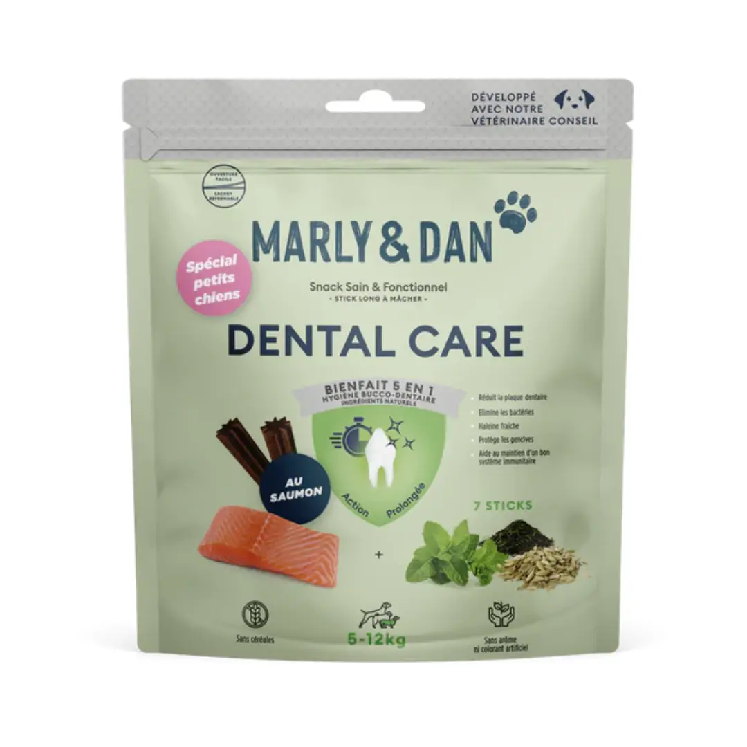 Délicieux snack à mâcher à base de saumon et d’ingrédients végétaux naturels de la marque française Marly & Dan pour les chiens de petite taille. Sa forme allongée et étoilée prolonge la mastication et favorise l’élimination de la plaque dentaire.