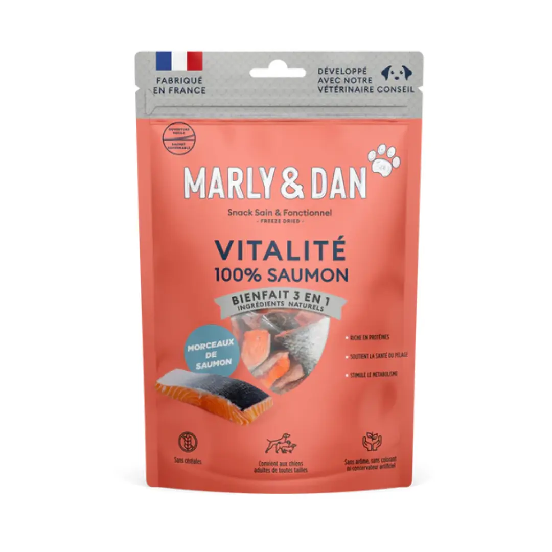 Délicieux snack naturel et nutritif de la marque Marly & Dan, composé uniquement de saumon lyophilisé. Le séchage par lyophilisation permet de préserver la qualité des éléments nutritifs actifs (vitamines, minéraux, lipides) de la matière première.
