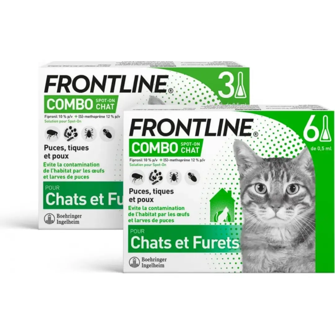 FRONTLINE COMBO Pipettes Antiparasitaires pour Chat & Furet, éliminent les puces, les tiques et les poux, et inhibent le développement des œufs, larves et des puces pendant 6 semaines chez le chat, protégeant ainsi leur environnement.