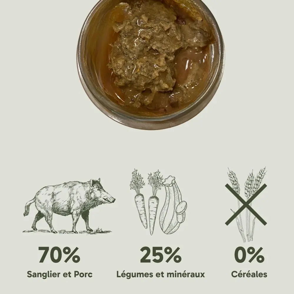 “La délicieuse pâtée Le Kabo au porc et au sanglier est un aliment complémentaire de qualité pour chien, à proposer en complément d’une alimentation complète et équilibrée, comme des croquettes ou une ration ménagère.Riche en protéines de qualité et pauvre en matières grasses, elle convient particulièrement aux chiens stérilisés, âgés ou peu actifs.”