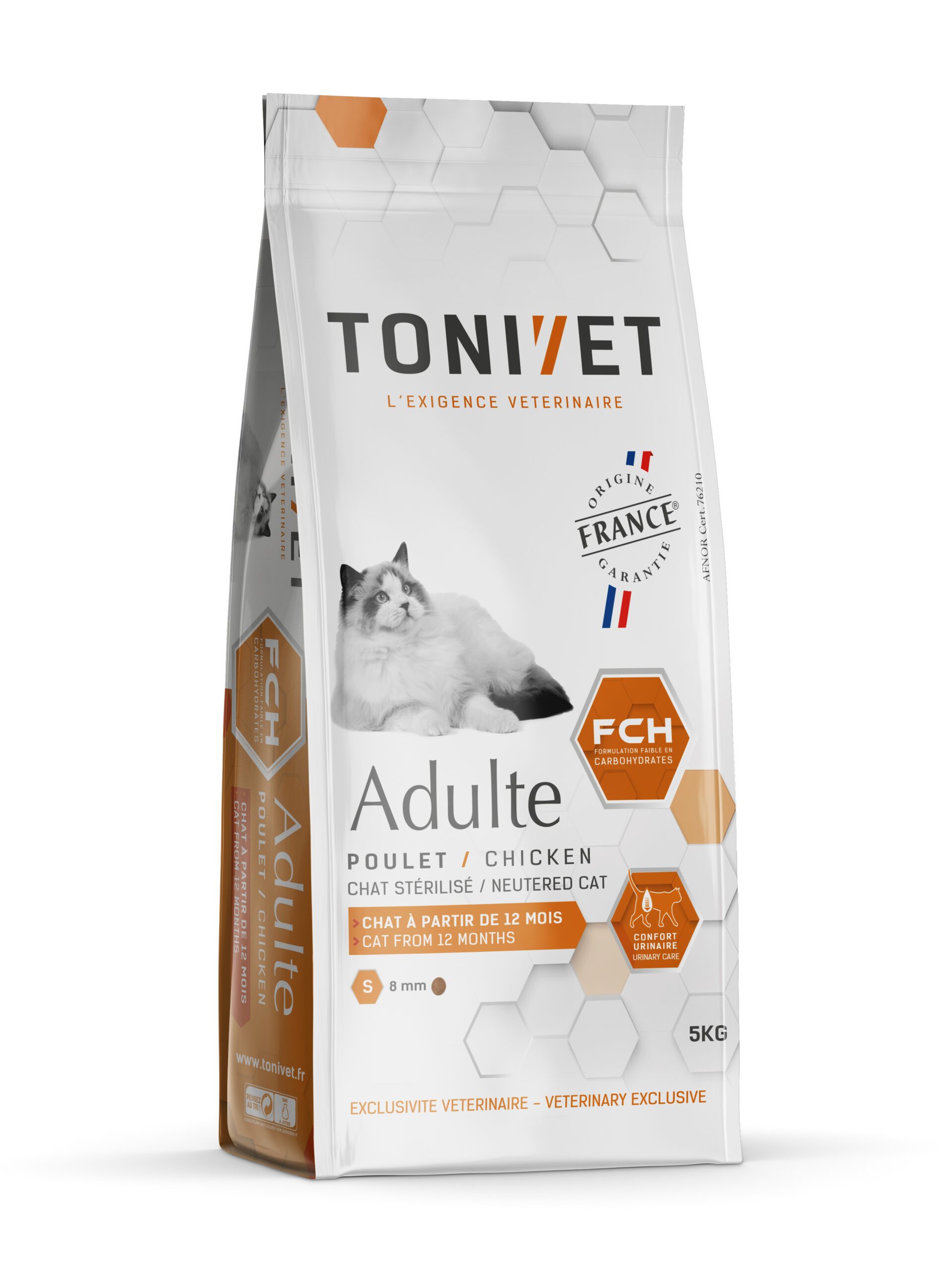 TONIVET CHAT ADULTE POULET apporte tous les nutriments nécessaires au chat adulte grâce à un apport énergétique – protéique optimal et possède une taille adaptée à leur morphologie. Il contribue à une digestion optimale et aide au bon équilibre de la flore intestinale. Il favorisera le soutien articulaire (glucosamine, chondroïtine, oméga 3), le pelage brillant (acides aminés soufrés) et le confort urinaire (artichaut, chélateurs, apport minéral contrôlé). Répond aux besoins du chat stérilisé.